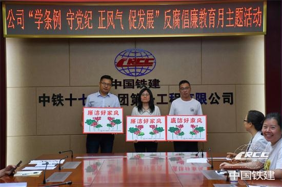 黨紀學(xué)習(xí)教育開展以來,中鐵十七局一公司各級黨組織齊“廉”動,一體推進黨紀學(xué)習(xí)教育與反腐倡廉宣傳教育月活動同步開展,進一步深化黨員對《中國共產(chǎn)黨紀律處分條例》的認識,提升黨性修養(yǎng),嚴明黨的紀律,弘揚正風(fēng)正氣,推動公司穩(wěn)定健康高質(zhì)量發(fā)展。